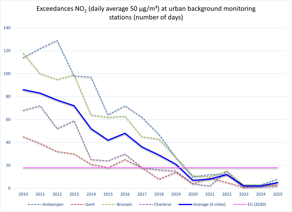 Le Parlement européen et le Conseil ont approuvé en octobre 2024 une directive révisée sur la qualité de l'air avec des valeurs limites plus strictes (pour le 01/01/2030) par rapport à la directive actuelle de 2008. La limite annuelle pour NO2 a été abaissée à 20 µg/m³. Si cette future valeur limite n'est pas respectée en 2026, les États membres devront établir une « feuille de route » au plus tard en 2028 spécifiant les mesures qui permettront d'atteindre la valeur limite à partir de 2030. En 2025, la valeur limite qui entrera en vigueur en 2030 a été (légèrement) dépassée dans les stations urbaines de fond à Anvers et à Bruxelles. Il semble toutefois que cette valeur sera respectée dans ces endroits en 2030. Aux endroits où le trafic est le plus dense, des concentrations comprises entre 30 et 40 µg/m³ sont encore mesurées actuellement (échantillonneurs passifs). Des efforts supplémentaires seront nécessaires pour atteindre la valeur limite européenne de 20 µg/m³ également à ces endroits très fréquentés d'ici 2030.