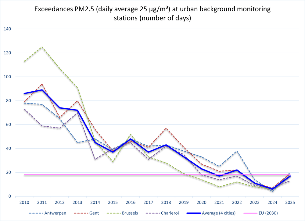 La valeur annuelle recommandée par l'Organisation mondiale de la santé, plus stricte 10 µg/m³, n'est respectée que dans les stations de surveillance les plus rurales en Flandre et au sud du sillon Sambre et Meuse.