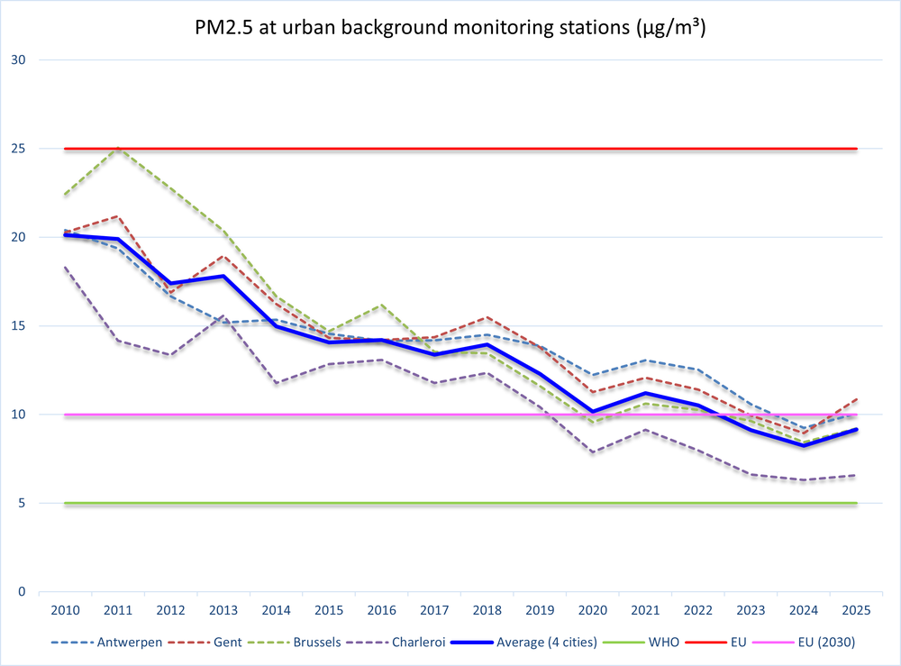 Pour 2025, on observe une augmentation des concentrations, comme illustré sur la figure ci-dessous qui reprend les concentrations moyennes annuelles basées sur les mesures effectuées dans 4 sites de mesure de la pollution de fond urbaine (Gand, Anvers, Bruxelles et Charleroi) entre 2010 et 2025.