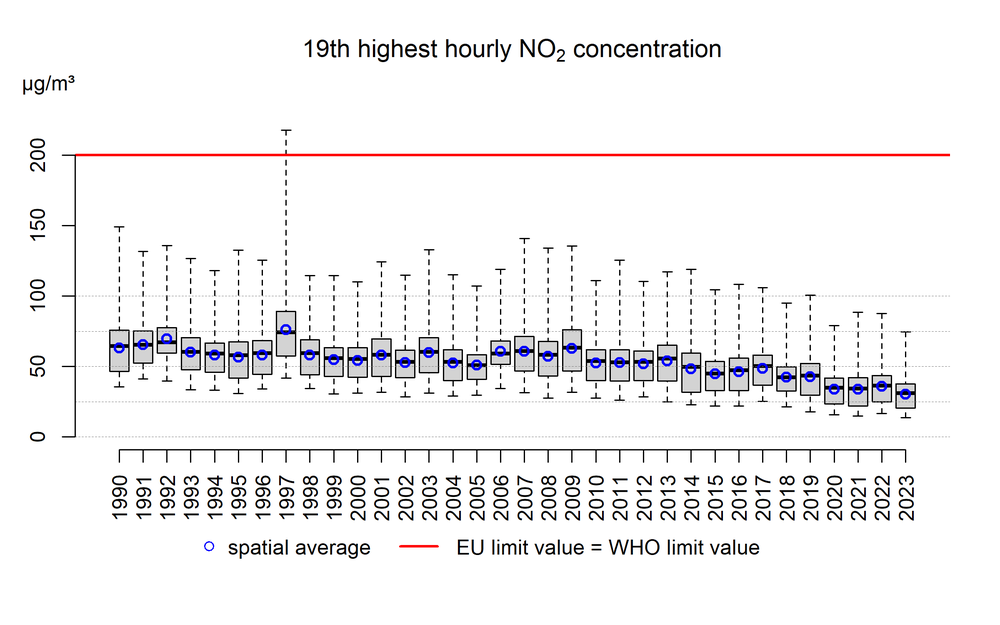 Diagramme en boîtes de la 19ème concentration horaire moyenne la plus élevée de NO2 (µg/m³) sur la période 1990–2023. La moyenne spatiale est indiquée par les cercles bleus. Toutes les données ont été calculées sur base de la technique d'interpolation RIO.