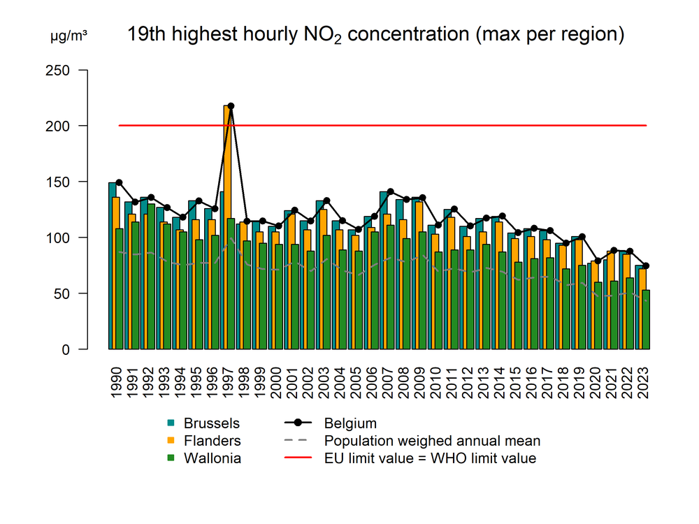 Pour protéger la population contre une exposition à des pics de concentration de NO2, la législation européenne impose une valeur limite horaire de concentration de 200 μg/m³. Cette limite horaire ne peut être dépassée plus de 18 fois (et donc 18 heures) par an. La 19ème valeur horaire la plus élevée en Belgique correspond au 99,8ème centile de toutes les concentrations moyennes horaires d’une année. En Belgique, cette valeur limite horaire est largement respectée. Très localement, sur des artères très fréquentées, il peut arriver que les 200 μg/m³ soient dépassés à quelques reprises par an, mais chaque station de mesure reste néanmoins sous la limite des 18 heures.