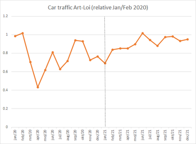 De figuur toont het aantal voertuigen per maand, relatief ten opzichte van het gemiddelde in de pre-corona maanden januari en februari 2020, dat dagelijks voorbij het drukke kruispunt Kunst-Wet te Brussel rijdt in 2020 en 2021 (databron: https://mobilite-mobiliteit.brussels/nl). De coronacrisis zorgde in de eerste helft van 2021 nog steeds voor minder autoverkeer maar evolueerde in de tweede jaarhelft naar (bijna) het niveau van voor de corona pandemie. De impact van de coronamaatregelen op de automobiliteit was in 2021 globaal wel kleiner dan in 2020.
