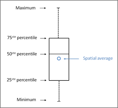 A box plot is an effective graphical representation of the distribution of a set of data. It shows the quartiles (or the 25th and 75th percentiles), the median (the 50th percentile) and the maximum and minimum of the set. The nth percentile is the value at which n% of all values is below and 100-n% of the values above the nth percentile.