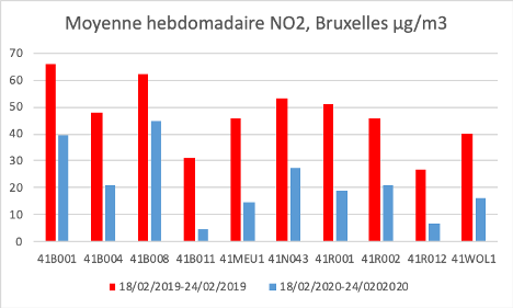 Quantifier exactement la proportion de cette diminution due aux mesures de confinement par rapport à l’impact d’autres facteurs, est un exercice difficile. En effet, évaluer la qualité de l’air sur une aussi courte période peut amener à des conclusions imparfaites. Ainsi la diminution des concentrations de NO2 pour les points de mesure de Bruxelles sur la semaine du 16 au 22/03 par rapport à la même période de l’an dernier montre une diminution de 35 %. Mais le même calcul pour la semaine du 18 au 24/02, donc avant le confinement, donne une diminution encore plus importante, presque 60%. Il faut toutefois noter que la météo de février (forte dispersion et précipitations importantes ) était particulièrement propice à des concentrations basses.