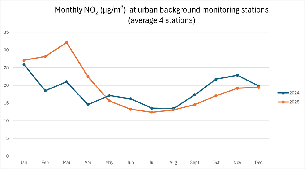 La légère augmentation des concentrations de NO2 en 2025 par rapport à 2024 est principalement due à des conditions météorologiques moins favorables. En 2024, les conditions météorologiques ont été très favorables à la qualité de l'air (avec notamment des précipitations record). Cela a permis d'observer les concentrations de NO2 les plus faibles jamais mesurées. A l’inverse au printemps 2025 (février, mars et avril), les conditions météorologiques ont été particulièrement défavorables à la qualité de l'air. Ces mois ont été en moyenne plus secs que la normale et il y a eu peu de vent (voir https://www.meteo.be/fr/climat/climat-de-la-belgique/bilans-climatologiques/2025/fevrier). Il est important de remarquer qu'à partir du mois de mai, les concentrations mensuelles moyennes en 2025 ont été inférieures à celles des mois correspondants de 2024. Grâce aux concentrations mesurées plus faibles à partir du mois de mai, la moyenne annuelle de 2025 n’est finalement supérieure que de 6% supérieure à la moyenne de 2024.