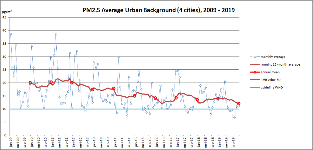 La figure ci-dessous reprend les concentrations mensuelles en PM2,5 pour 4 stations de mesure de fond urbain (Gand, Anvers, Bruxelles et Charleroi) : de très faibles concentrations de particules fines ont été mesurées en septembre et octobre et sont les plus basses jamais enregistrées. La concentration annuelle moyenne en PM2,5 dans ces 4 villes atteint 12,1 µg/m3 pour 2019 (données jusqu’au 28/12/2019). Dix ans auparavant, en 2009, les concentrations atteignaient 20.0 µg/m3.
