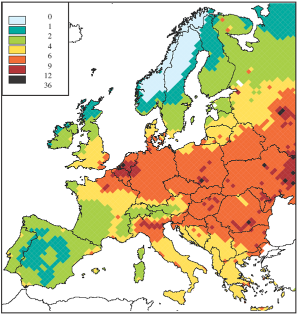 verlies aan levensverwachting door PM2.5 uitgedrukt in maanden (prognose voor 2010). Deze inschatting is gebaseerd op modelresultaten, niet op metingen!