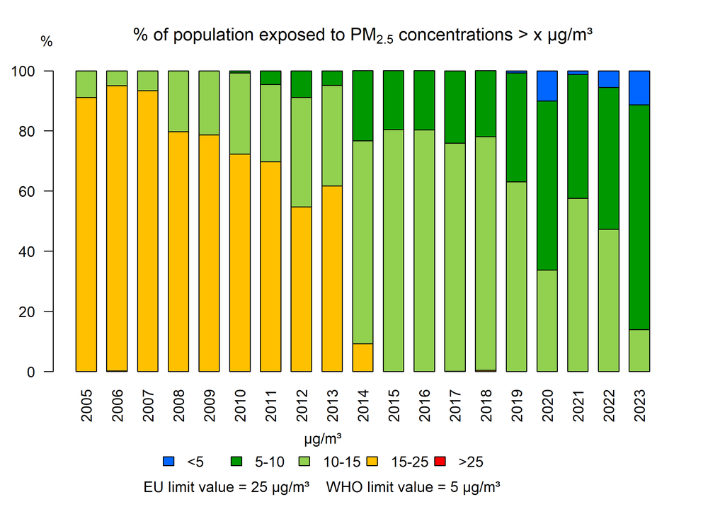 In 2022 werd de Belgische bevolking niet blootgesteld aan jaargemiddelde PM2.5-concentraties hoger dan 15 µg/m³, ruim onder de EU grenswaarde van 25 µg/m³. De bevolkingsblootstelling aan concentraties boven de WGO-advieswaarde van 5 µg/m³ echter, bedroeg 94,5 %.