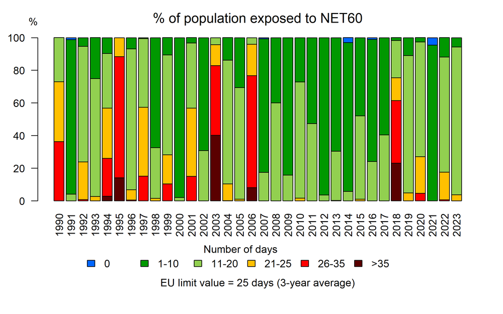 Uit de evolutie van het percentage van de bevolking dat blootgesteld wordt aan dagelijkse hoogste 8-uurgemiddelde ozonconcentraties boven 120 μg/m³ is het duidelijk dat de ozonconcentraties sterk variëren. 2021 was nog een uitzonderlijk gunstig ozonjaar, in 2022 werd de gehele bevolking blootgesteld aan minstens 4 dagen met een hoogste 8-uurgemiddelde ozonconcentratie boven 120 µg/m³, voor 88 % van de bevolking was dat zelfs meer dan 10 overschrijdingsdagen.