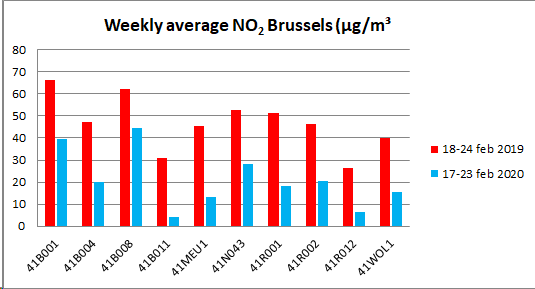 In 2020 waren de NO2 concentraties 55% lager (en dit zonder maatregelen in het kader van de COVID19 crisis) vergeleken met dezelfde periode in februari in 2019. Zowel in maart als februari waren de NO2 concentraties voor vergelijkbare weken duidelijk lager in 2020 vergeleken met 2019. In februari speelde het weer een belangrijke rol: in februari 2020 waren er enkele stevige voorjaarsstormen. Dit zorgde voor een sterke verdunning van de luchtvervuiling met lage NO2 concentraties. Ook in de week in maart waren de weersomstandigheden in 2020 gunstiger dan in 2019. Wat in de periode in maart de dominante factor was, de gunstige weeromstandigheden of de lagere uitstoot door minder autoverkeer, kan op basis van alleen metingen niet bepaald worden.